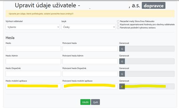 Po kliknutí na Upravit profil se zobrazí formulář, ve kterém můžete heslo pro mobilní aplikaci nastavit.